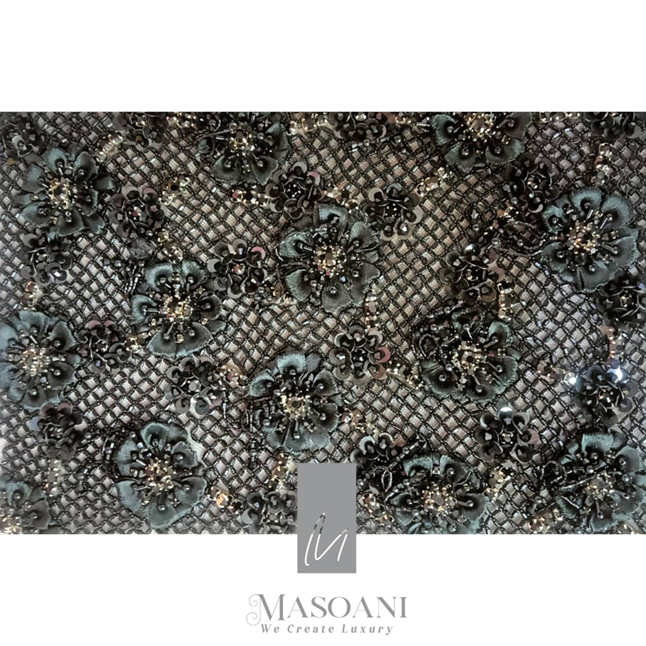 In sharing this black sequins, cut beads, and ribbon floral embroidery sample, we invite you to embark on a journey into the enchanting world of haute couture, where every creation is a masterpiece waiting to be discovered.